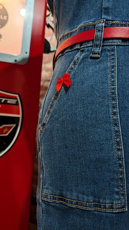 Rejoignez la communauté des Copines oups avec cette combinaison en jean stretch, un modèle unique qui vous permettra d’affirmer votre style rockabilly.