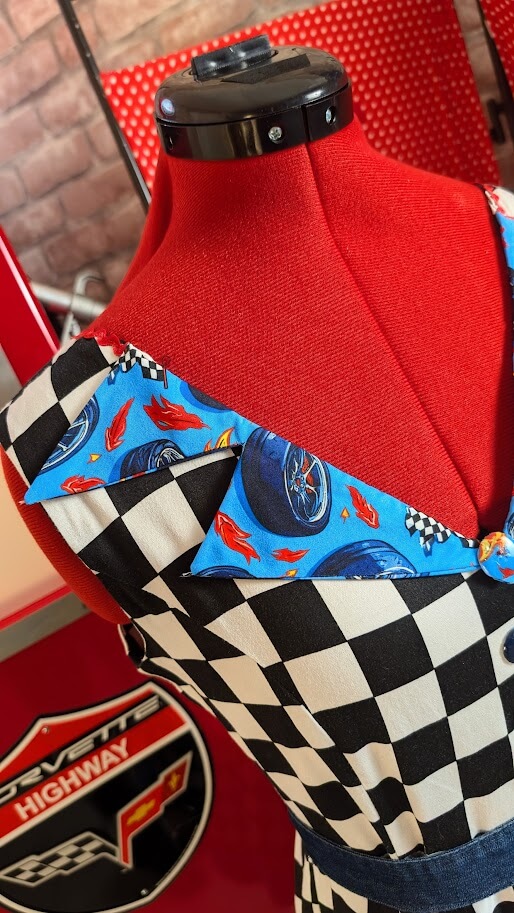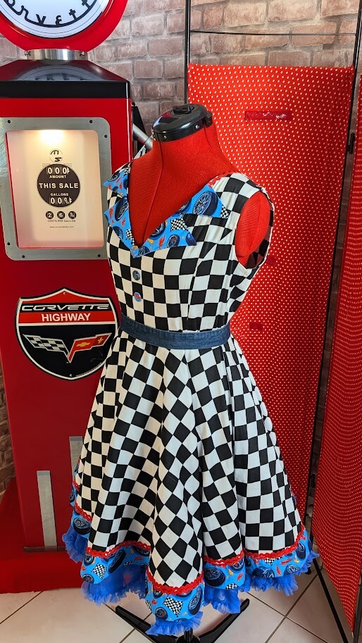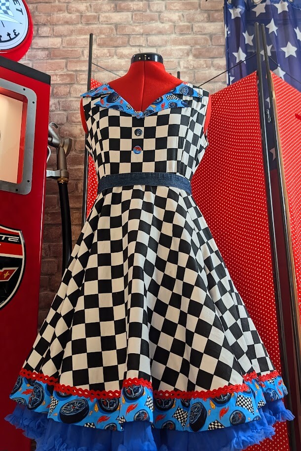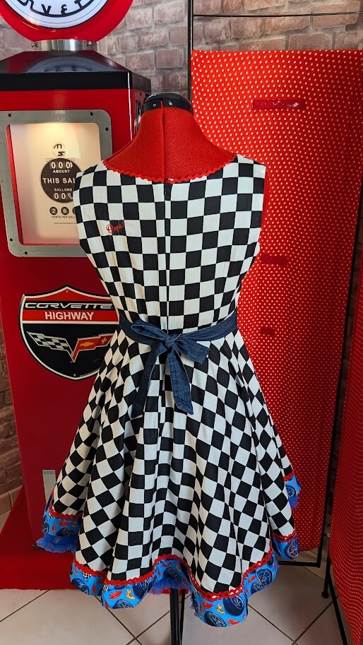 Cette robe pin up swing au damier emblématique se refait une beauté avec des détails mécaniques uniques, pour un look résolument vintage et audacieux.