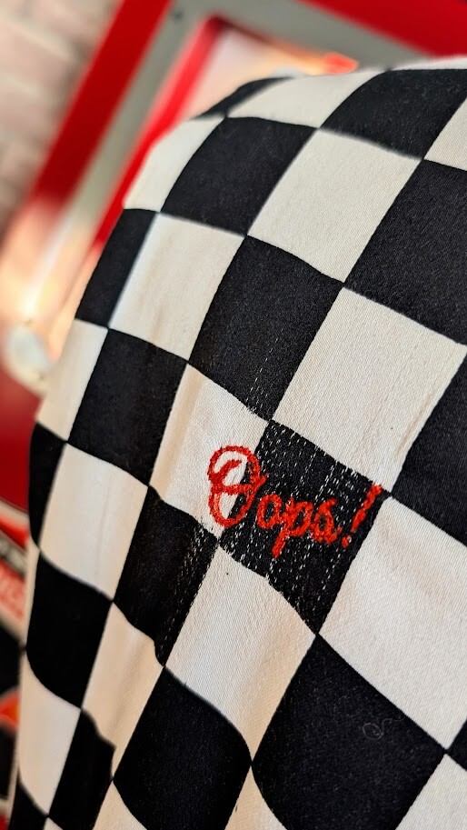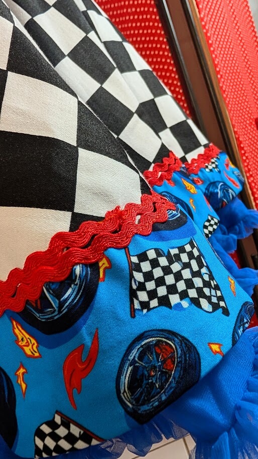 Motif: Damier noir et blanc, avec rappels pneus et flammes