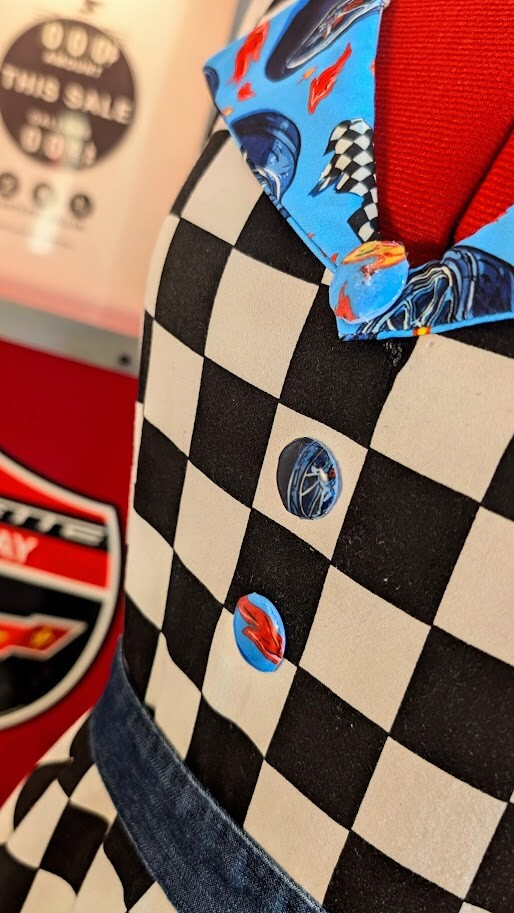 Détails artisanal et artistique: Col et bas de jupe coordonnés, 3 boutons en résine UV faits main et double ornement rouge soulignant l’ourlet avec ma signature brodée.