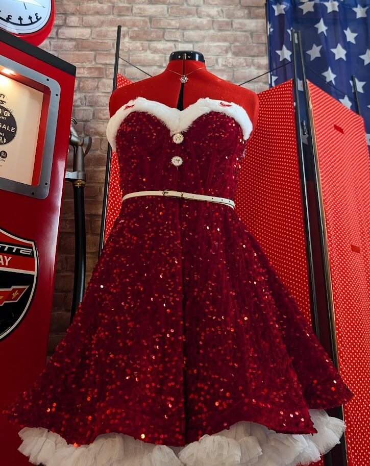 Célébrez les fêtes avec cette robe Pin up de noël coupe bustier scintillante et son col fourrure, idéale pour incarner une mère noël glamour et audacieuse.