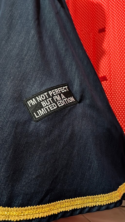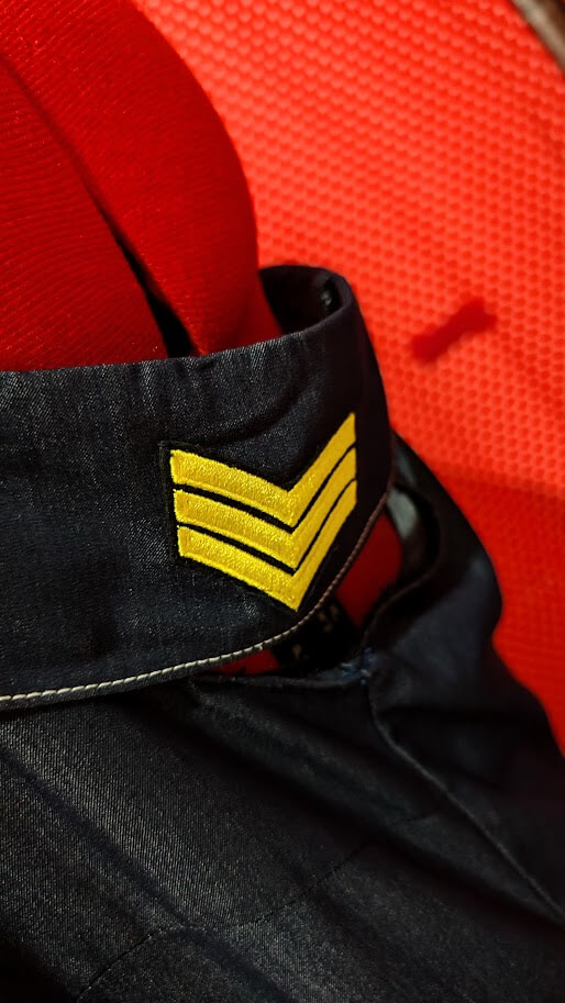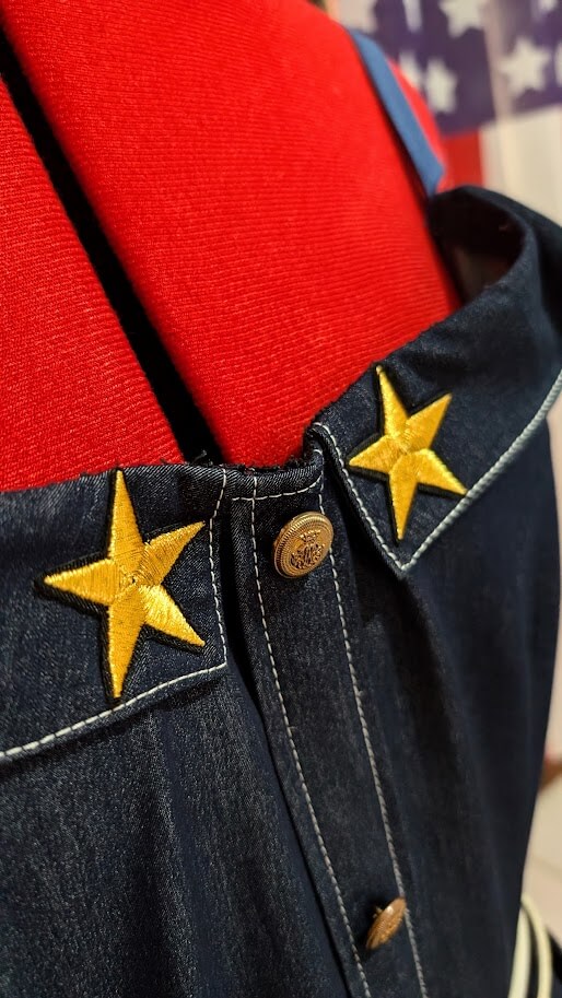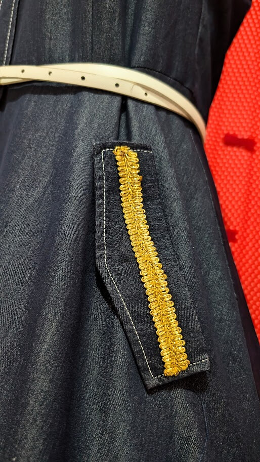 Ornée de galons dorée et de chevrons sur les épaules, elle fusionne l’élégance glamour des années 50 avec une allure d’uniforme de parade.