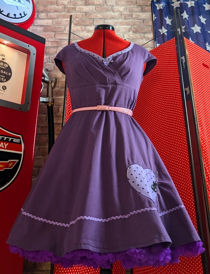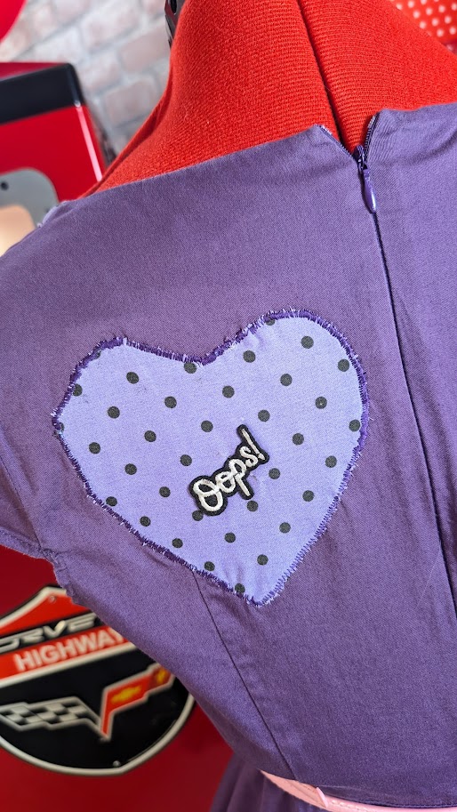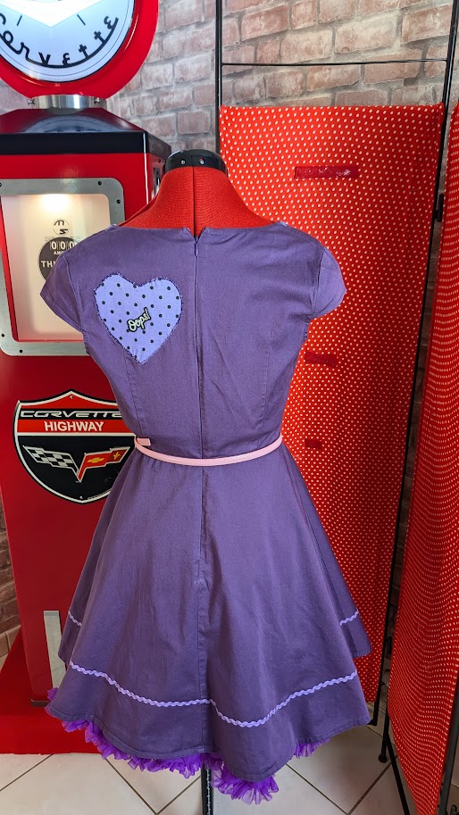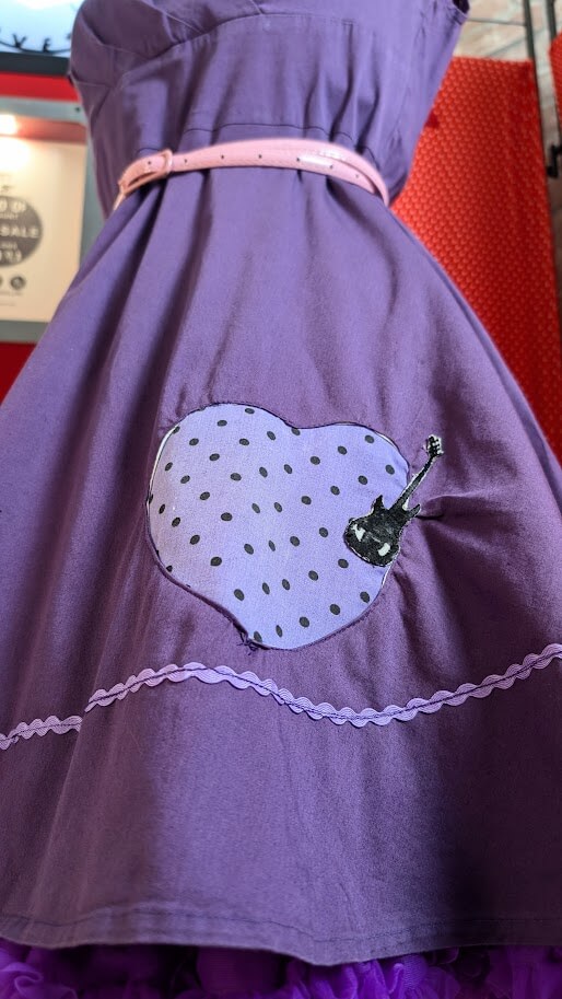 Détails: Finitions artisanales avec motifs violets à pois sur l’encolure et appliqués cœurs, complétées par une broderie artisanale « motif guitare » en bas de robe pour un côté ludique et résolument Rock ‘n’ Roll.