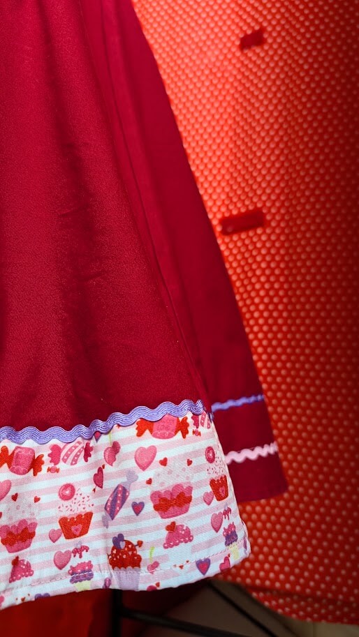 Finitions & Ornements: Galons fantaisie colorés, motifs cœurs et cupcakes, agrémentés de boutons chinés.